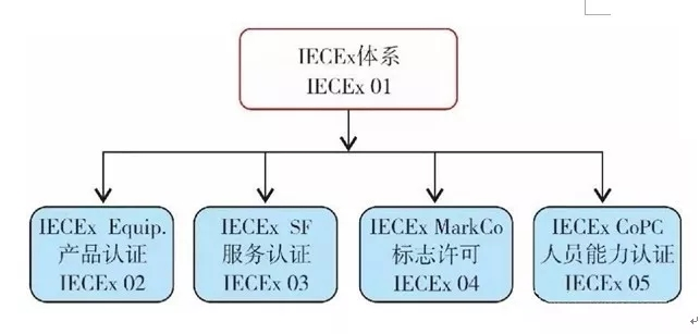 IECEx認(rèn)證系統(tǒng)包括IECEx02產(chǎn)品認(rèn)證,IECEx03服務(wù)認(rèn)證,IECEx04標(biāo)志許可,IECEx05人員能力認(rèn)證見圖1。